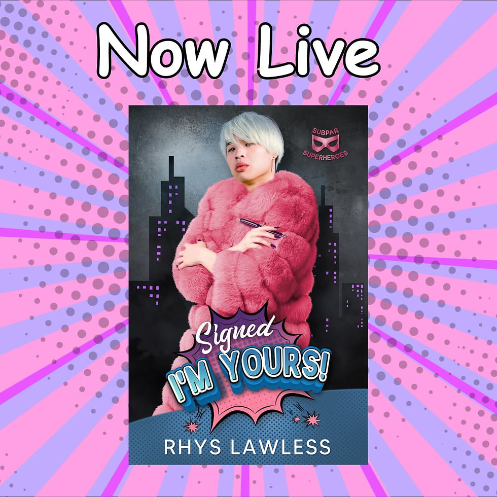 Signed, I'm Yours is a standalone paranormal romcom with a grumpy supervillain, an always-happy good guy literally stuck together on a case, a fake instant engagement, a very convenient bi-awakening, and only one bed.