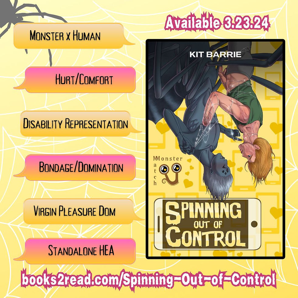 Teracht is a small spider. Well, small in the monster world, anyway. The human world offers the opportunity to, hopefully, not be eaten, and his webbing is useful in all sorts of medical and military technology. But what is a little spider creature with a big domination kink and a fear of leaving the house supposed to do to meet someone?